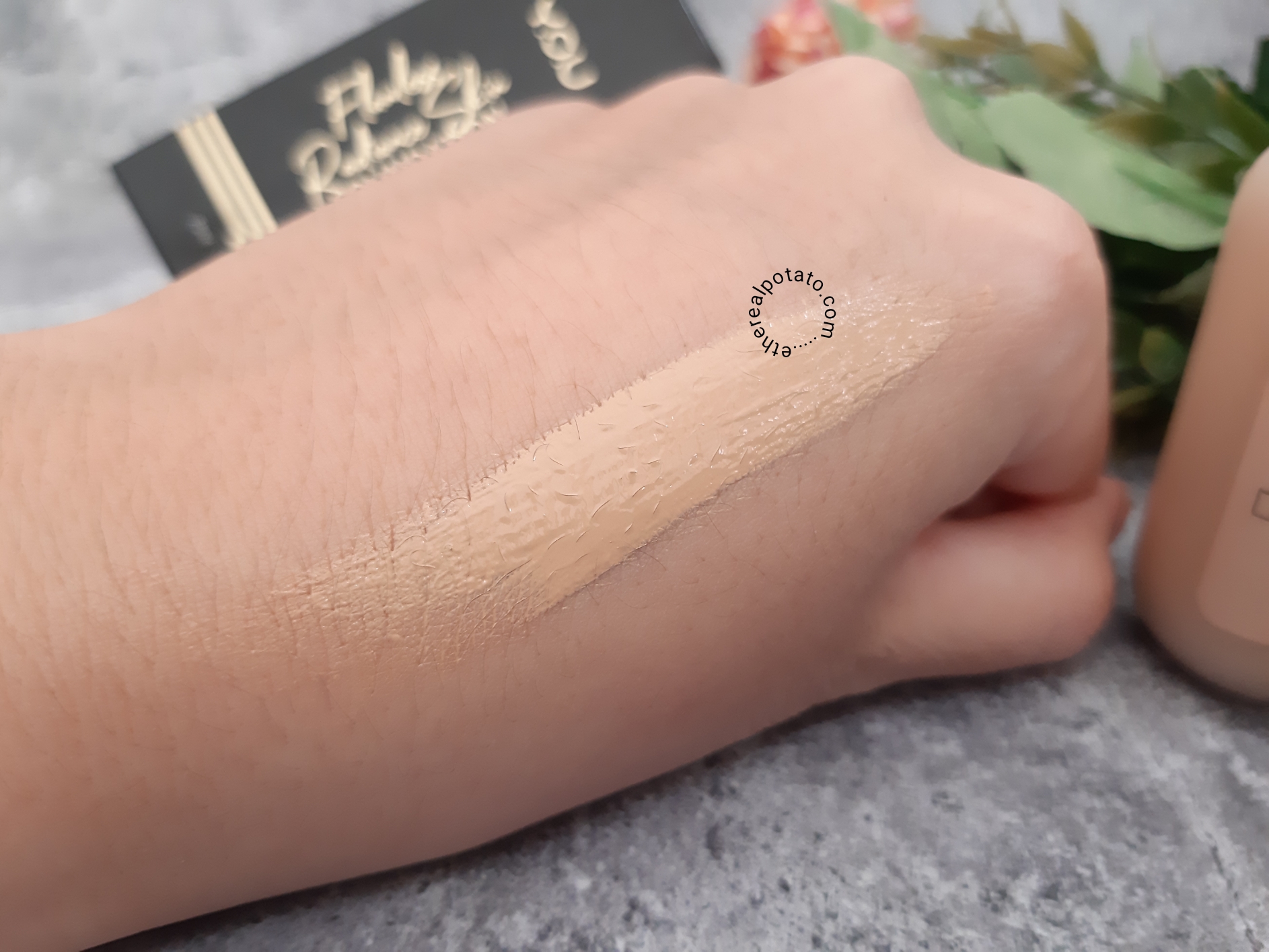 Tekstur YOU Flawless Radiance Skin Foundation ini cukup kental, dia ngga runny, tapi ngga sampai creamy juga. Teksturnya tuh "terasa berat" tapi ternyata engga, feelsnya tetap ringan walau nampaknay terasa berat. Menurut aku pribadi foundation YOU ini mudah untuk disebar namun sedikit lebih sulit untuk diratakan. Teksturnya sedikit lengket gitu sehingga lebih sulit diratakan. Jika diratakan menggunakan brush, maka tekstur dari brush ini akan nampak pada hasil foundation yang sudah diaplikasikan.